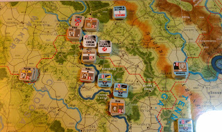 Thus my attempts to cross the creek in the North are shut down and I am without two divisions for the rest of the scenario as they are now at fatigue 4. Worse then this though is my -6 VP's lost in these two attacks. I have to get 8 or more VP's for a win in this scenario, so the odds are starting to look long.