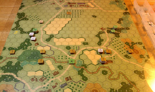 As I began setting up I made a critical error. I didn't 'do the math' on the building control mechanics thus I was more or less in the dark about the specifics. I knew generally that I needed to try and hold the buildings on my side of the board as they paid points at the end of the game. I also knew that there were about six buildings on the edge of board 2a that paid VPs for the first three turns. Additionally there were two hexes (cross roads) that paid 5VP each for their control at the end of the game. Thus I knew all the mechanics, but I didn't go over it before I set up so that I know what I would have to do. It turns out that the VPs available are very tightly balanced between the two forces and the game will be decided by a narrow margin. In the end I don't think I would have done anything differently on set up had I gone through this exercise, but I felt like I had already given an advantage to Rikk before we made the first WC DR.